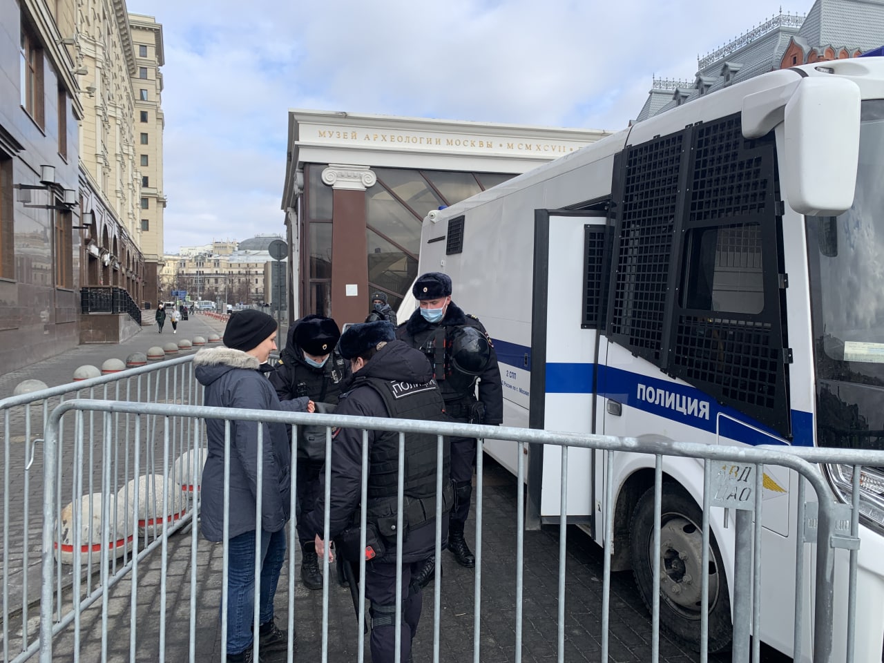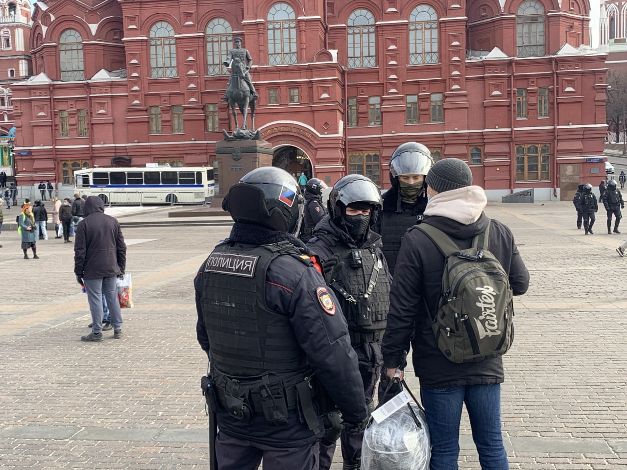 К часу стали собираться протестующие на Манежной площади в Москве. Она к тому времени уже была оцеплена сотрудниками полиции и Росгвардии. Сначала задержаний не было, людей пускали.