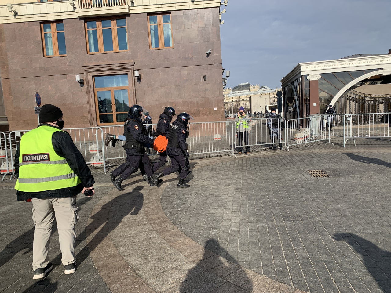 А вот еще одно жесткое задержание. Уже в начале третьего дня. Это тоже Москва. Манежная.