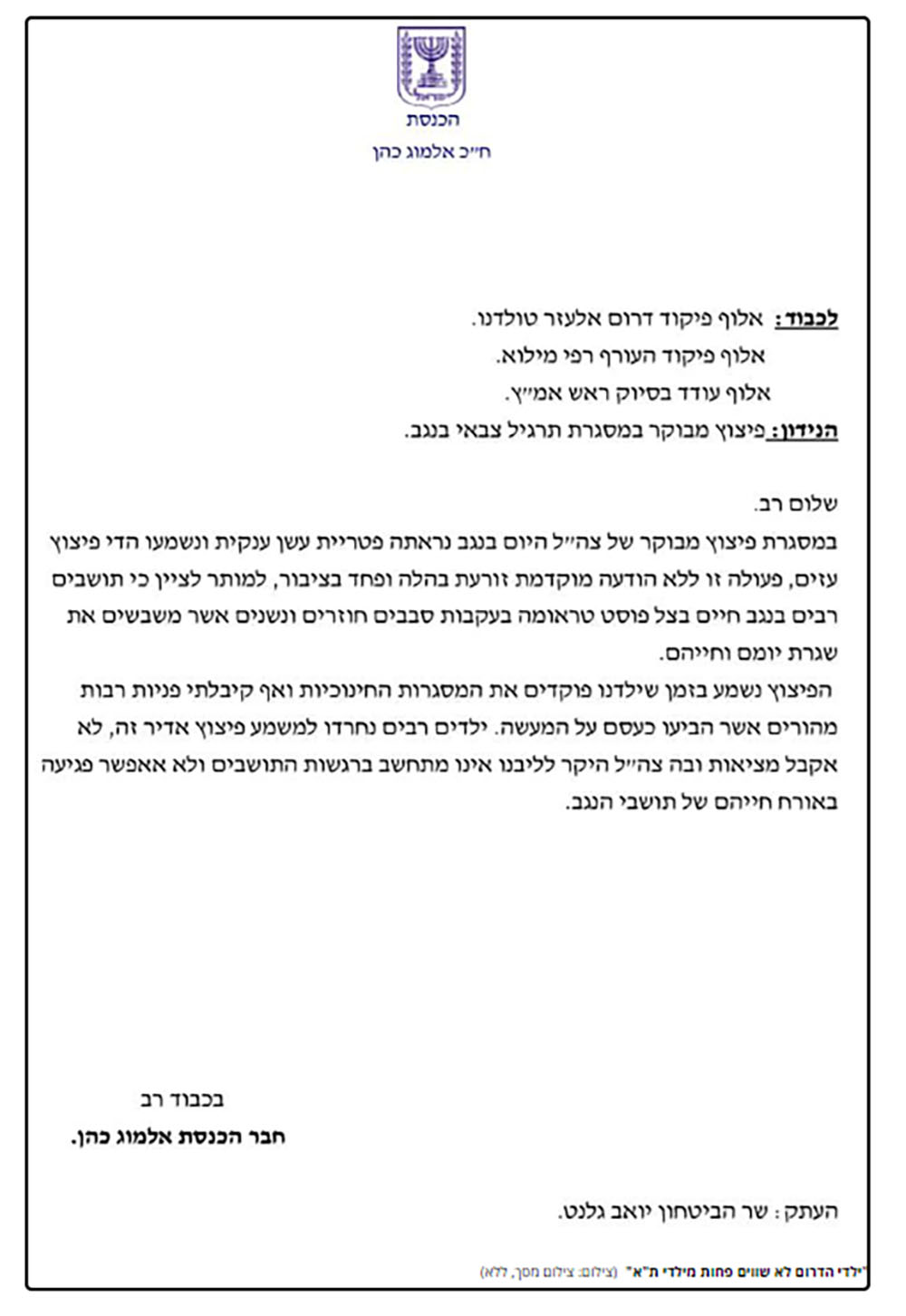 Неизвестно, подействовало ли обращение депутата, но уже сегодня вечером в ЦАХАЛ выразили сожаление о том, что жители юга не были предупреждены заранее о взрыве, добавив, что инцидент будет расследован.
