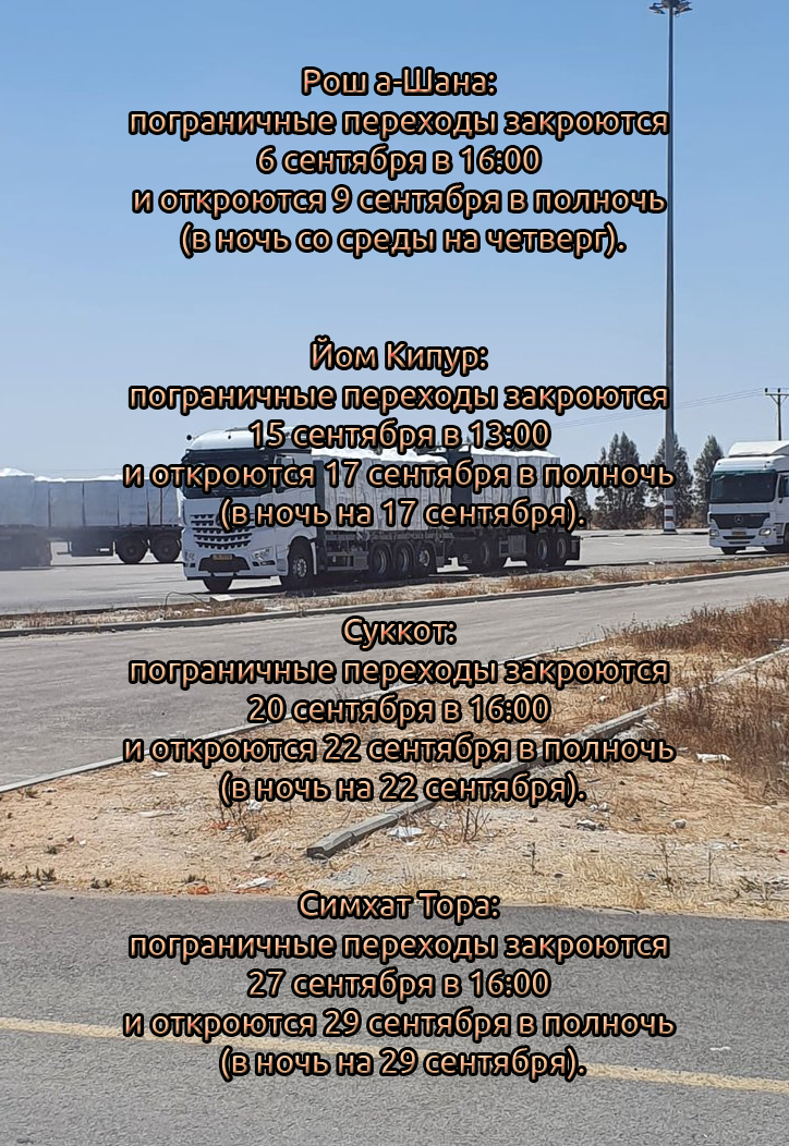 Во время празднования Тишрей территория Иудеи и Самарии, а также контрольно-пропускные пункты в секторе Газа будут полностью закрыты. Об этом сегодня сообщил официальный представитель ЦАХАЛ.