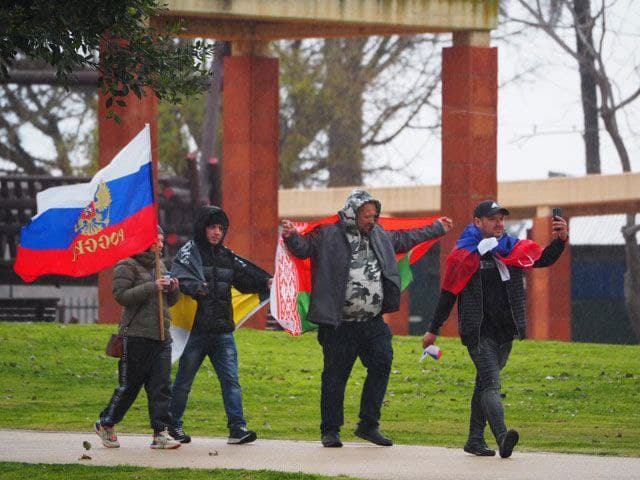 Примерно через час к митингующим в честь российской «спецоперации» попыталась «присоединиться» группа людей с украинскими флагами. Правда, после того как они отправили участников акции по маршруту «русского военного корабля», в дело вмешалась полиция. Проукраинских активистов попросили отойти от русских.