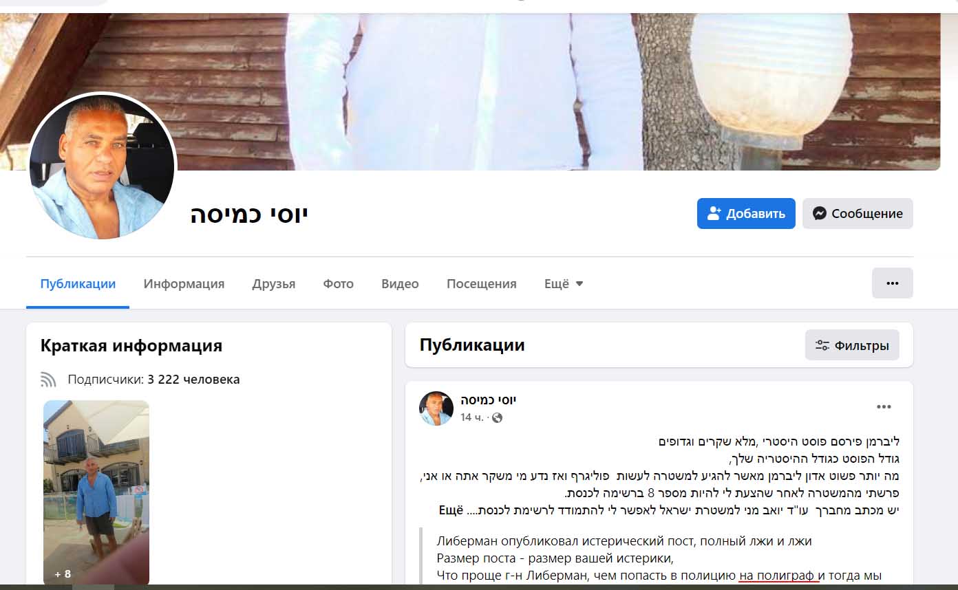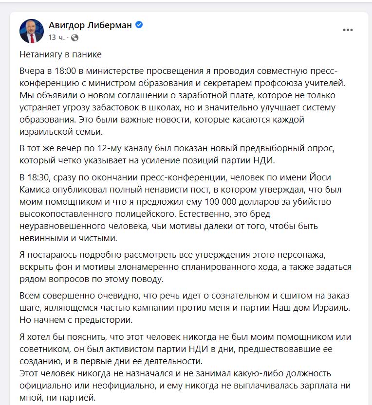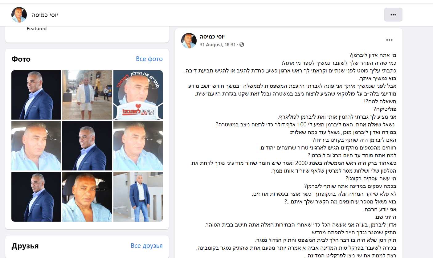 Камиса пишет, что знает все это, поскольку тогда был помощником Либермана. Кстати, он и раньше называл его в соцсетях главой преступного клана. Но нынешнее обвинение превзошло все, что было ранее.