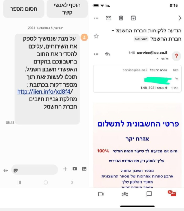 В последнее время израильтянам стали приходить электронные письма и текстовые сообщения с логотипом «IEC», где говорится об угрозе отключения света. В компании «Хеврат хашмаль» предупредили, что злоумышленники рассылают от их имени сообщения, призывающие «погасить свой долг», перейдя по ссылке, ведущей в платежную систему, или по электронной почте.