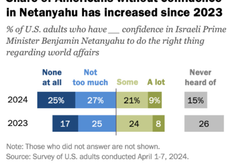 Опрос был проведен с 1 по 7 апреля 2024 года среди 3600 взрослых жителей США и указывает на растущий скептицизм в отношении лидерских качеств Нетаньягу. По результатам, 25% участников опроса заявили, что совсем не доверяют премьер-министру Израиля, что на 11 процентов больше, чем по аналогичному опросу в 2023 году.